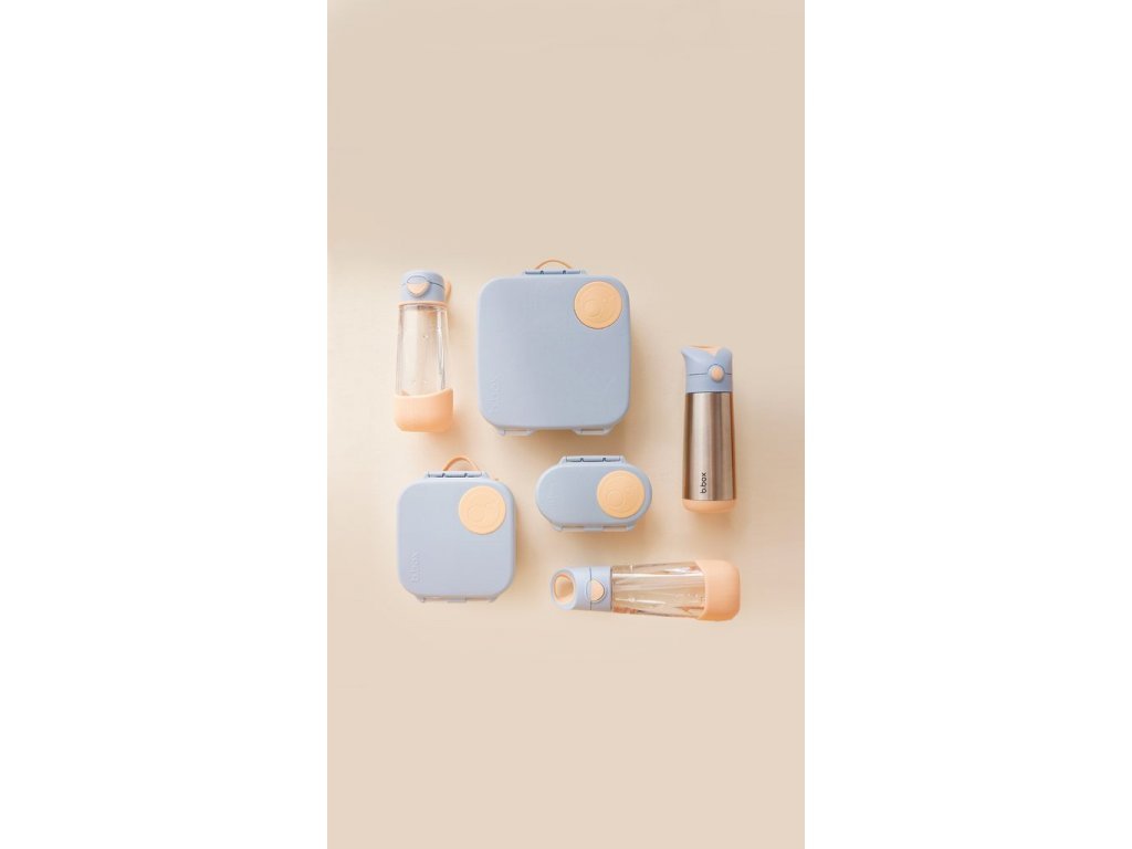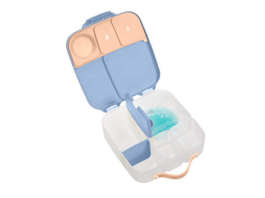 Krabička na svačinu, do které se vejde úplně všechno! Děti si během dne rády vybírají z dobrot, které jim připravíte. A tak b.box navrhl variabilní lunchbox, do kterého zabalíte nespočet různých druhů svačinek. Najdete zde oddělení pro půl krajíce chleba nebo sendvič, pod pohyblivým víčkem je ukrytý chladivý polštářek, který udrží tuto dobrotu déle čerstvou. Pokud pohyblivé víčko odstraníte, máte rázem dostatečně velký prostor pro těstoviny nebo salát. Naprosto jedinečné zpracování víčka krabičky s elastickým kroužkem umožní vložit do krabičky celé jablko! Silikonové dvojité víčko pak umožní skladovat v menších odděleních ovoce nebo jogurt (nikoli tekutity). Některé vitřní "přepážky" jsou vyjímatelné a nastavitelné, takže si tento svačinový box přestavíte podle svých chutí a potřeb. Do lunchboxu se vejde i wrap nebo banán.