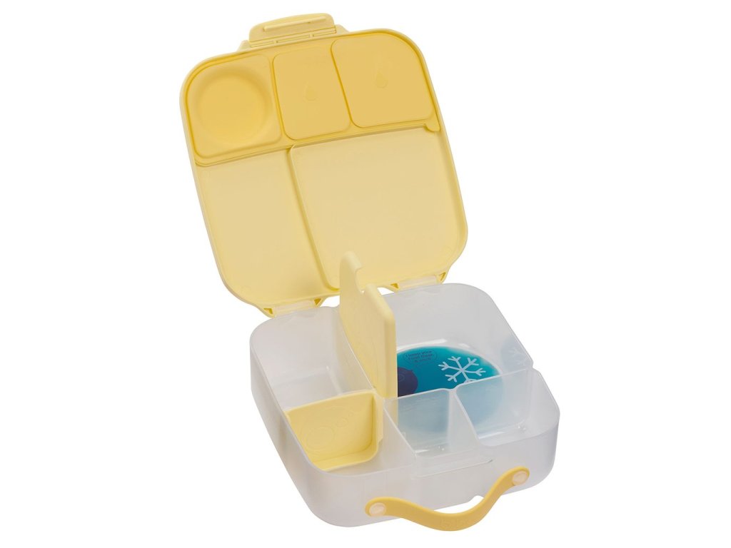 Najdete zde oddělení pro půl krajíce chleba nebo sendvič, pod pohyblivým sendvičovým víčkem je ukrytý chladivý polštářek, který udrží tuto dobrotu déle čerstvou. Pokud pohyblivé víčko odstraníte, máte rázem dostatečně velký prostor pro těstoviny nebo salát. Naprosto jedinečné zpracování víčka krabičky s flexibilním silikonovým těsněním umožní vložit do krabičky celé jablko! Silikonové těsnění pak umožní skladovat v menších odděleních ovoce nebo jogurt (nikoli tekutiny). Jedna z vnitřních "přepážek" má vyjímatelný posuvný rozdělovač, se kterým si tento svačinový box přestavíte podle svých chutí a potřeb. Do krabičky se vejde i wrap nebo banán.