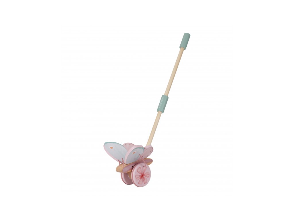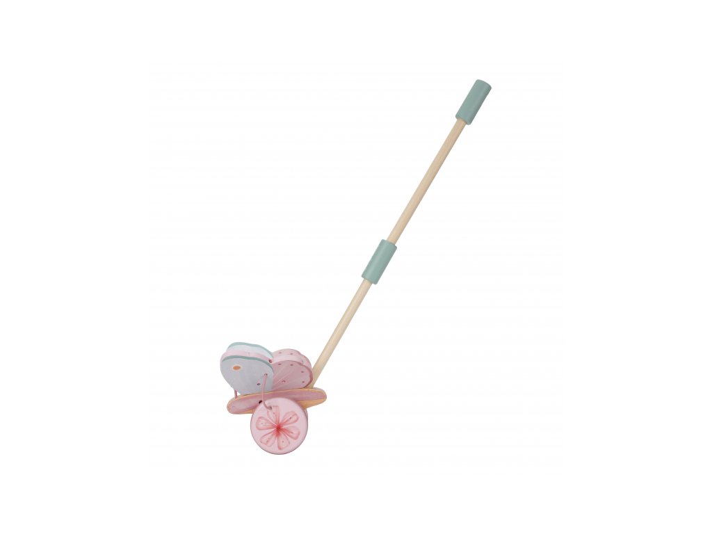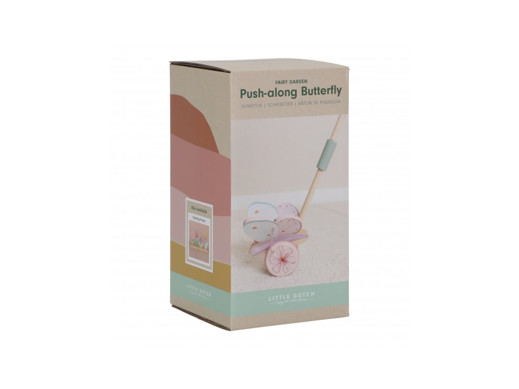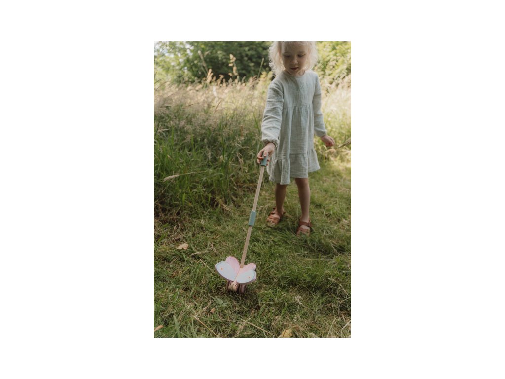 Dřevěný motýl na tyči v krásném dřevěném provedení láká dítě, aby jej tlačilo před sebou. Motýl při pohybu mává křídly, dítě je motivováno k samostatné chůzi a zároveň mu držení hračky dodává při chůzi pocit větší jistoty. Gumové proužky na obvodu válečku chrání podlahu před poškrábáním. Hračka je součástí designové kolekce hraček a doplňků Little Dutch Fairy Garden inspirované životem na zahradě. Vyrobeno z dřeva certifikovaného FSC. Rozměry: 14 x 12 x 59 cm Vhodné pro děti od 18 měsíců.