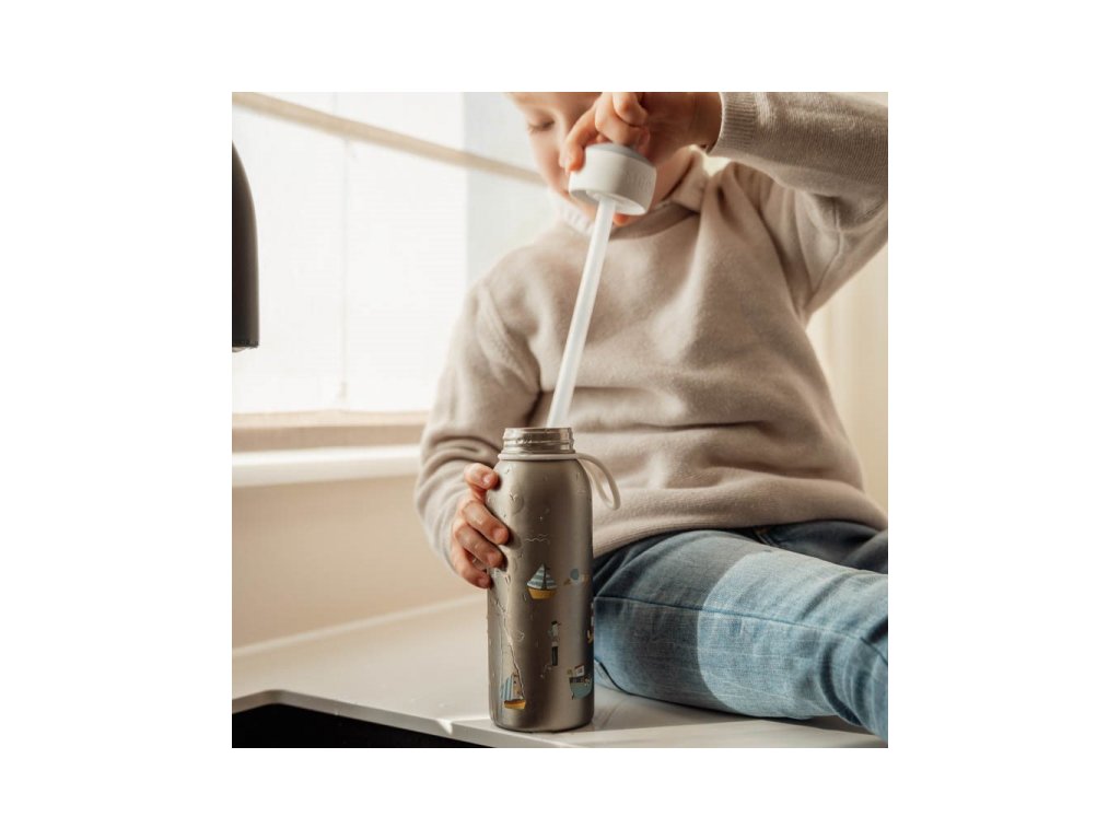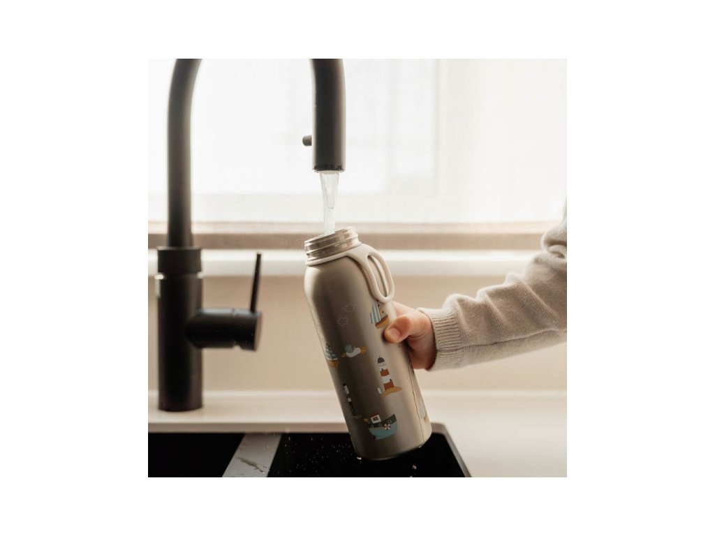 Termoláhev Little Dutch je vyrobena z vysoce kvalitní dvoustěnné oceli a udrží nápoj déle teplý (až 9 hodin) nebo studený (až 12 hodin). Je tak vhodná pro zahřátí teplým nápojem během procházek v zimě a naopak pro osvěžení chladným nápojem během horkých letních dní. Zaklapávací pítko s odnímatelným brčkem umožňuje snadné pití bez nutnosti naklánění láhve. Bez brčka je možné láhev používat i pro sycené nápoje. Odnímatelné poutko usnadňuje přenášení. Zaklapnutím pítka je chráněn obsah láhve před vylitím. Termoláhev je součástí designové kolekce Little Dutch Námořnický záliv, ve které najdete jídelní doplňky pro dětské stolování, ložní prádlo, dekorativní doplňky do dětského pokoje i dřevěné a plyšové hračky. Jednotlivé součásti láhve lze rozebrat pro snadné mytí. Plastové části je možné mýt v myčce, nerezové tělo láhve je pro udržení dlouhé životnosti doporučeno mýt ručně. Objem: 350 ml Rozměry: 20,2 x 6,5 x 7 cm Hmotnost: 310 g Složení: nerezová ocel, PP Neobsahuje BPA.