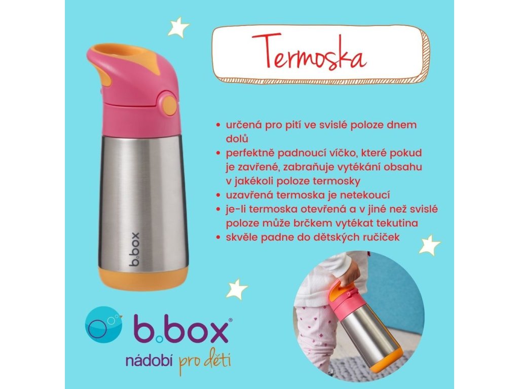 Udržujte své děti hydratované stylově a s lehkostí s inovativní termoskou na pití! Termoska australské značky b.box je navržená s důrazem na praktičnost a stylový design a díky těmto vlastnostem bude nepostradatelným doplňkem pro všechny, kdo chtějí mít svůj oblíbený nápoj vždy po ruce! Termosku z nerezové oceli značky oceníte po celý rok ať už jste na výletě, ve škole, na cestách či při sportu.