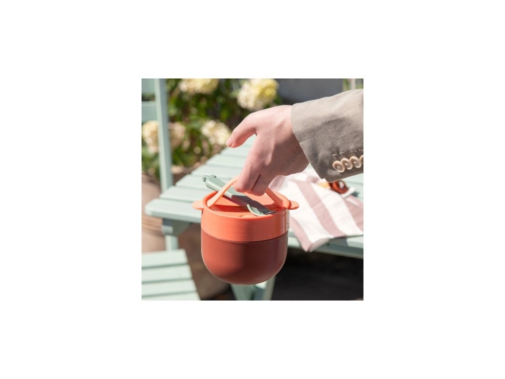 Miska na oběd má čistý design v moderních barvách. Šroubovací víko udrží dobroty uvnitř. Odnímatelná silikonová rukojeť usnadňuje přenášení misky i malým ručkám.