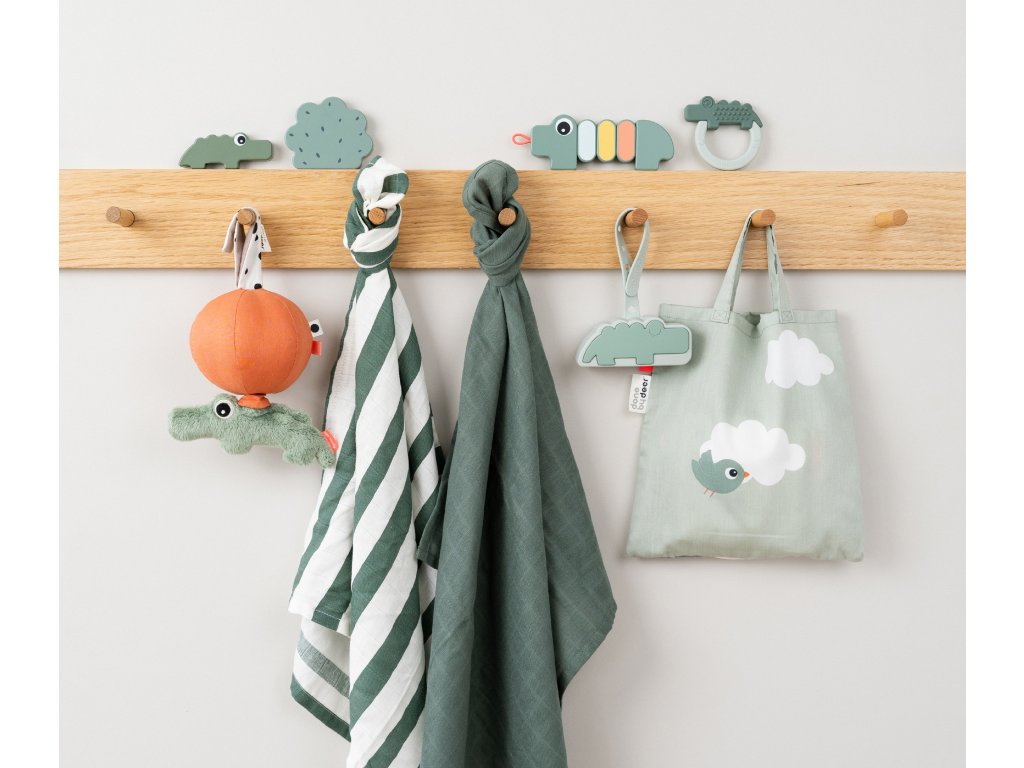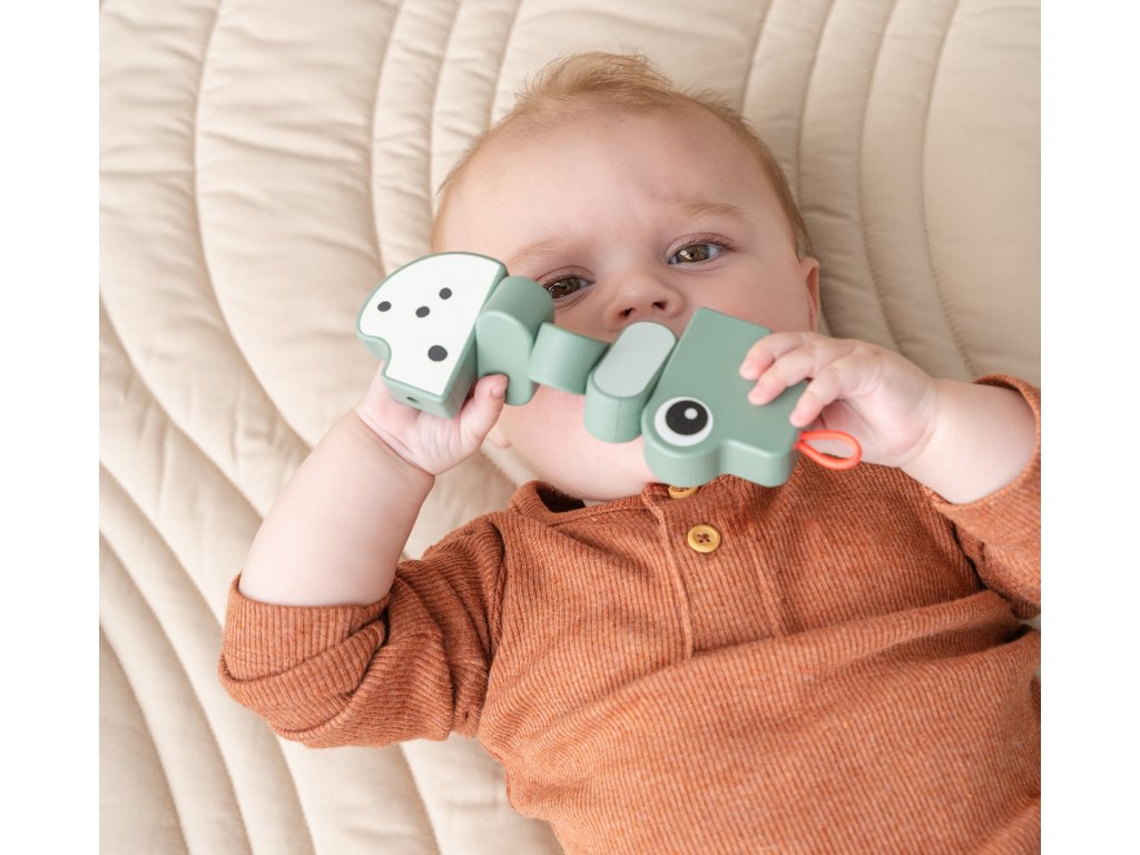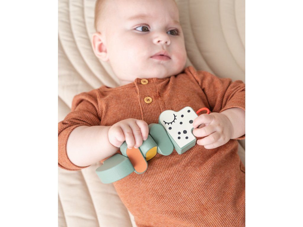 Hračka Croco twist & turn je zábavou pro malé prsty, aby ji objevovaly. Doporučeno od 6 měsíců. Ohebné klouby trénují jemnou motoriku a pohyb rukou. Zábavné barvy a kontrasty pro vizuální stimulaci. Elastické poutko pro připojení hračky usnadňuje připevnění na polštářek kočárku nebo pohodlné lehátko. Vyrobeno ze zodpovědně získaného dřeva a natřeno vodou ředitelnou barvou, která neobsahuje škodlivé látky, takže je pro vaše dítě bezpečné si s ním hrát.