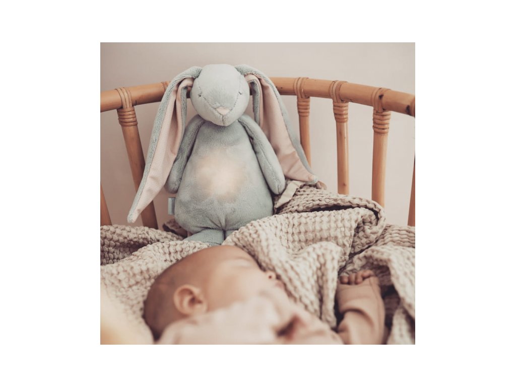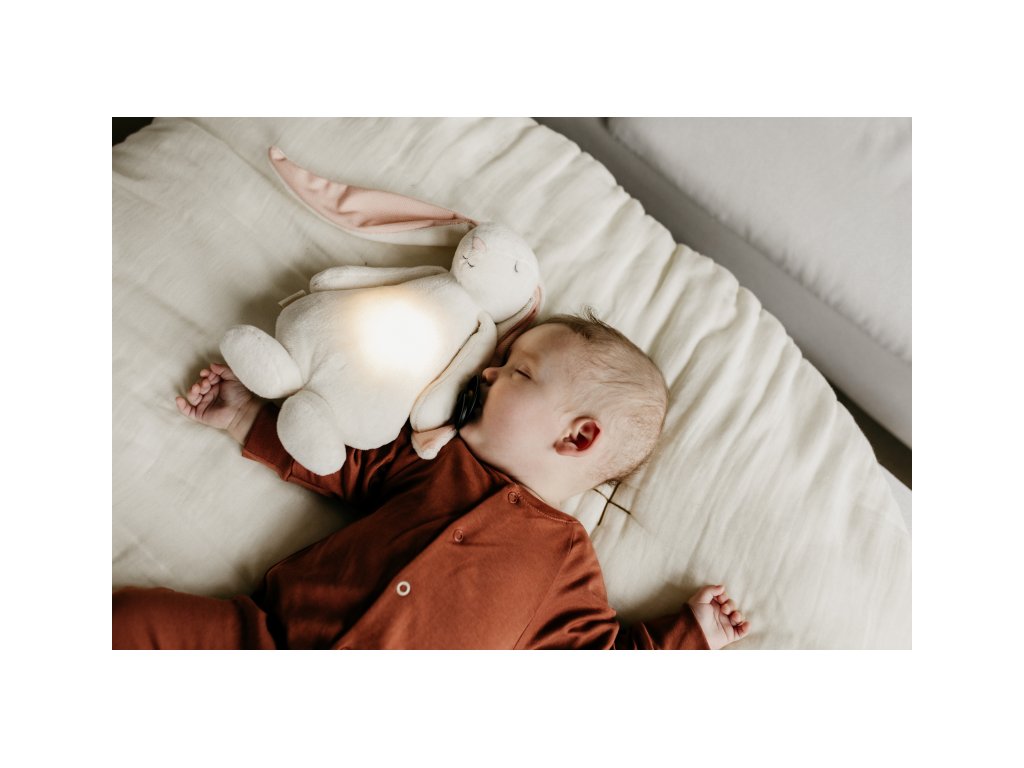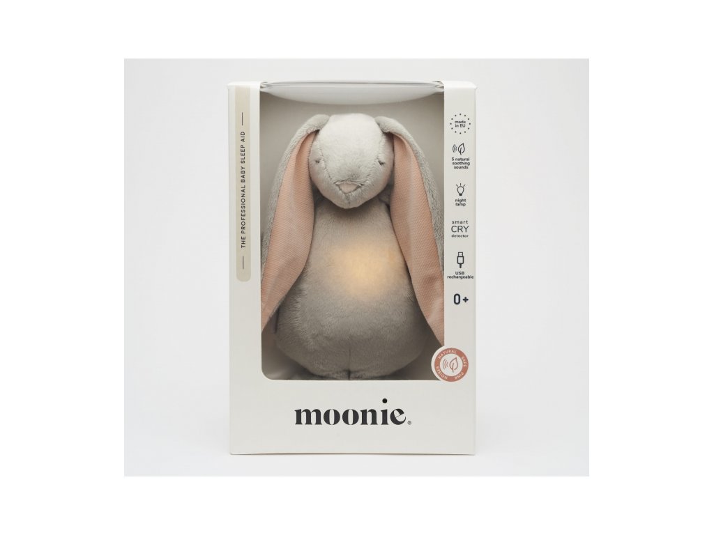 Moonie usínáček v podobě roztomilého zajíčka s nočním světlem a relaxačními zvuky pomáhá miminku uklidnit se a snáze usnout. Uklidňující zvuky připomínají dítěti prostředí v děloze maminky před jeho narozením. Usínáček nabízí pět přírodních relaxačních zvuků (tlukot srdce, vítr, lesní potok, mořské vlny, déšť), kalimba ukolébavku, dvě klasické ukolébavky a umožňuje nahrání vlastního hlasu. Bříško zajíčka svítí a slouží jako noční světlo s výběrem sedmi barev svícení. Jemné světlo pomáhá dítěti cítit se v postýlce bezpečně. Světlo je možné zapnout i bez zvuků. Při zapnuté funkci Shake světlo zapnete zatřesením hračkou. Zajíček se při svícení nijak nezahřívá a je pro dítě zcela bezpečný. Funkce časovače umožňuje nastavit dobu přehrávání na 30, 60 nebo 90 minut, než modul přejde do režimu inteligentního senzoru pláče. Inteligentní senzor aktivuje zvuk a světlo, když dítě začne plakat. Hračka pak přehrává relaxační zvuky a jemně svítí po dobu 20 minut. Hudební modul umožňuje nastavení hlasitosti a doby přehrávání dle vašich preferencí. Hračka se dobíjí s pomocí USB kabelu, k plnému nabití potřebuje 3 hodiny. Plně nabitá baterie vydrží až 8 hodin nepřetržitého provozu se zapnutým světlem a zvukem. USB kabel je součástí balení. Po vyjmutí zvukového a svítícího modulu můžete hračku prát v pračce. Moonie zajíček je vyroben z nejkvalitnějších, certifikovaných a bezpečných materiálů pro děti. Hračka byla testována švýcarskou laboratoří SGS a je v souladu se směrnicí 2009/48/ES o bezpečnosti hraček. Všechny materiály, ze kterých je zajíček MOONIE vyroben, jsou certifikovány OEKO-TEX a jsou super jemné a příjemné na dotek. Rozměry: 28 x 16 x 10,5 cm Vhodné pro děti od narození.
