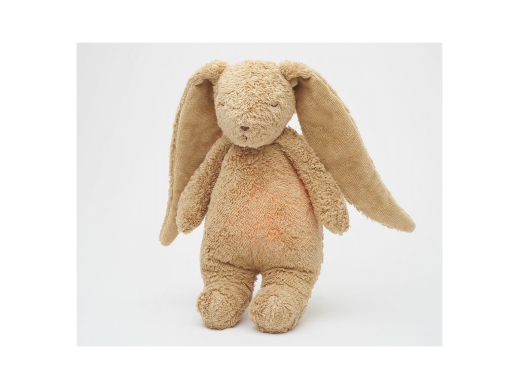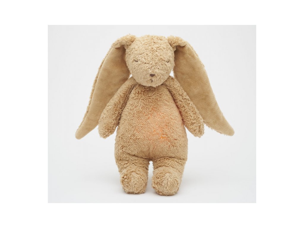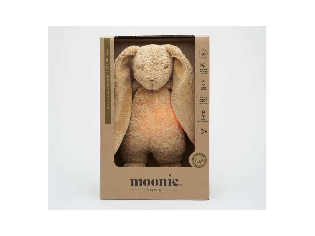 Moonie usínáček v podobě roztomilého zajíčka s nočním světlem a relaxačními zvuky pomáhá miminku uklidnit se a snáze usnout. Uklidňující zvuky připomínají dítěti prostředí v děloze maminky před jeho narozením. Usínáček nabízí pět přírodních relaxačních zvuků (tlukot srdce, vítr, lesní potok, mořské vlny, déšť), kalimba ukolébavku, dvě klasické ukolébavky a umožňuje nahrání vlastního hlasu. Bříško zajíčka svítí a slouží jako noční světlo s výběrem sedmi barev svícení. Jemné světlo pomáhá dítěti cítit se v postýlce bezpečně. Světlo je možné zapnout i bez zvuků. Při zapnuté funkci Shake světlo zapnete zatřesením hračkou. Zajíček se při svícení nijak nezahřívá a je pro dítě zcela bezpečný. Funkce časovače umožňuje nastavit dobu přehrávání na 30, 60 nebo 90 minut, než modul přejde do režimu inteligentního senzoru pláče. Inteligentní senzor aktivuje zvuk a světlo, když dítě začne plakat. Hračka pak přehrává relaxační zvuky a jemně svítí po dobu 20 minut. Hudební modul umožňuje nastavení hlasitosti a doby přehrávání dle vašich preferencí. Hračka se dobíjí s pomocí USB kabelu, k plnému nabití potřebuje 3 hodiny. Plně nabitá baterie vydrží až 8 hodin nepřetržitého provozu se zapnutým světlem a zvukem. USB kabel je součástí balení. Po vyjmutí zvukového a svítícího modulu můžete hračku prát v ruce. Zajíček je součástí produktové řady Moonie Organic, vyráběné z cetifikované organické bavlny, barvené netoxickými barvami. Bavlna pochází z produkce bez použití pesticidů a toxických hnojiv. Při pěstování organické bavlny se používá o 50% méně vody ve srovnání s průmyslovým pěstováním. Výplň hračky tvoří recyklovaný materiál. Hračka byla testována švýcarskou laboratoří SGS a je v souladu se směrnicí 2009/48/ES o bezpečnosti hraček. Rozměry: 28 x 16 x 10,5 cm Vhodné pro děti od narození.