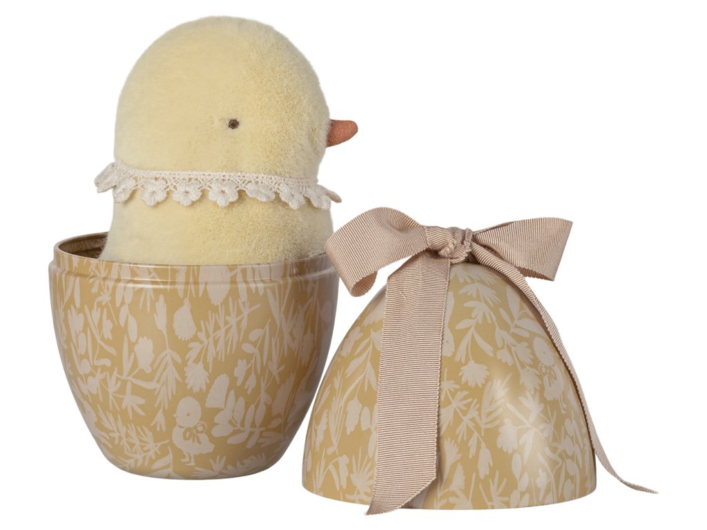 Hebké kuřátko ukryté v krásném kovovém dekorativním vajíčku od značky Maileg.