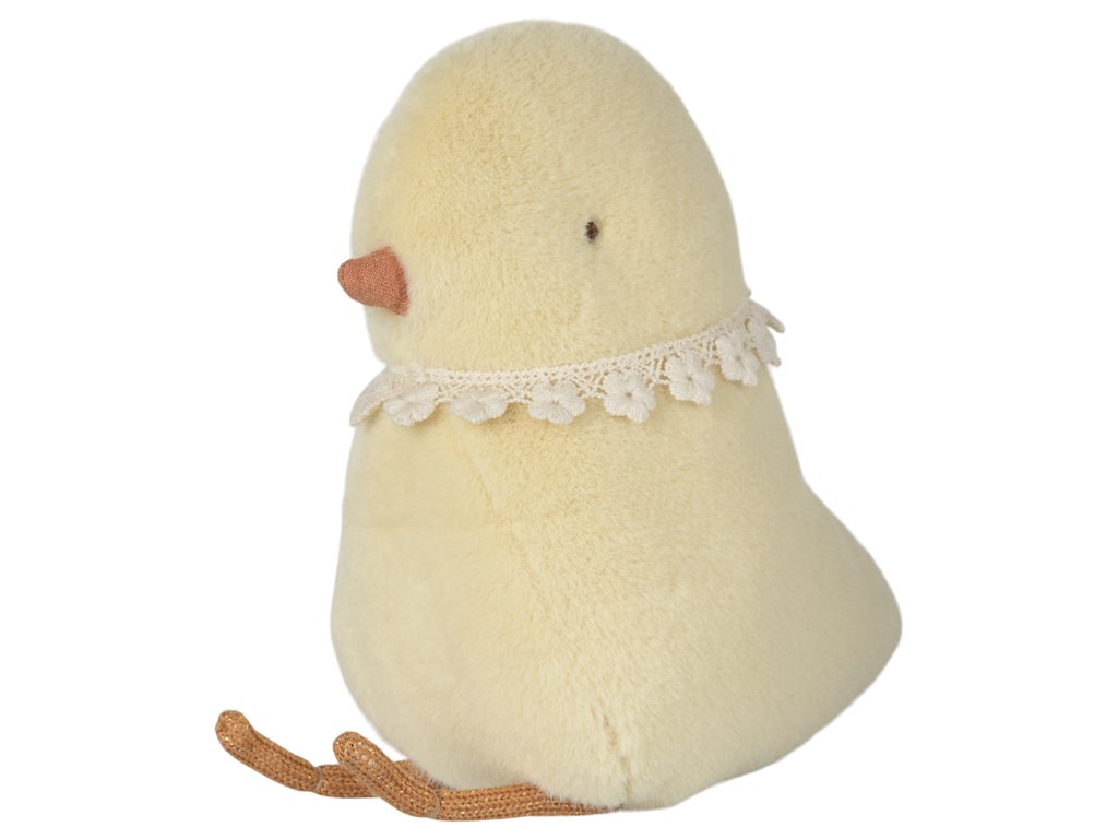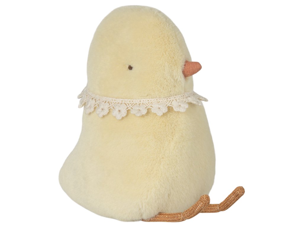 Plyšové kuřátko nosí jemný krajkový límec inspirovaný vintage stylem a plechové vajíčko zdobí elegantní mašle.