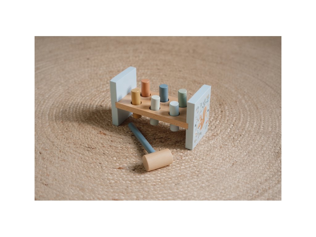Klep sem, klep tam! Trefí vaše dítě všechny kolíčky? Pomocí kladiva je potřeba zatlouct 6 barevných kolíků do dřevěného stojanu. Až se to podaří, stačí stojan otočit a začít znovu! Můžete zatloukat pořád dokola! Hračka pomáhá rozvíjet jemnou motoriku vašeho dítěte. Zatloukačka je součástí designové kolekce hraček a doplňků Little Dutch Forest Friends inspirované životem v lese. Rozměry: 23 x 16 x 11,5 cm Vhodné pro děti od 12 měsíců.